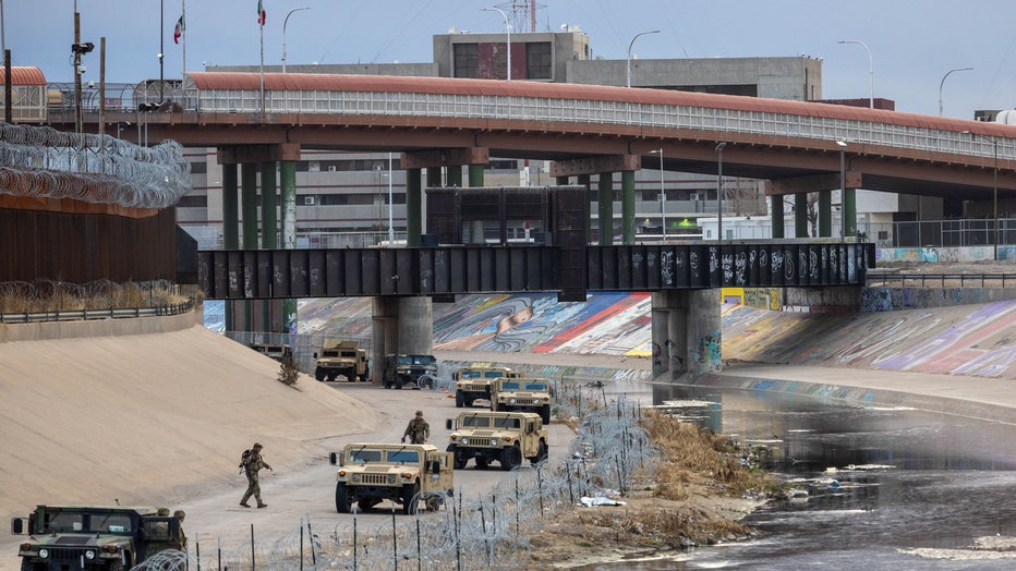 Texas National Guard soldiers stand guard at the U.S.-Mexico border on January 07, 2023 as viewed from Ciudad Juarez, Mexico. U.S. President Joe Biden is set to visit El Paso on January 8th (Photo by John Moore/Getty Images)