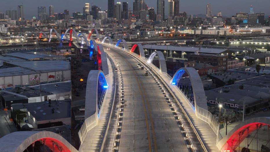 The bridge first opened in July 2022. The $588-million span, which replaced an 84-year-old Art Deco span, runs 3,500 feet (1,066.80 meters) over the concrete-lined Los Angeles River and connects downtown to the historic Eastside.