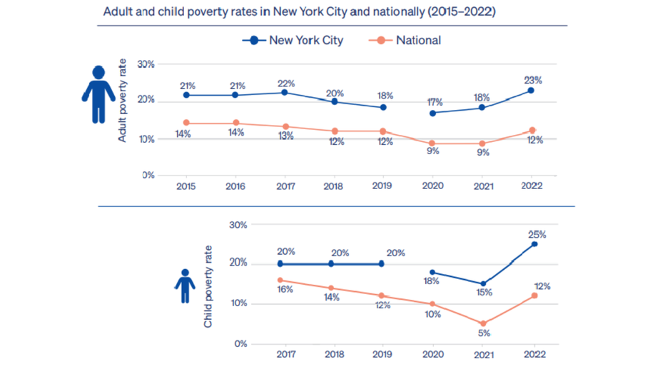 - More than 23% of adult New Yorkers and 25% of children in New York City lived in poverty