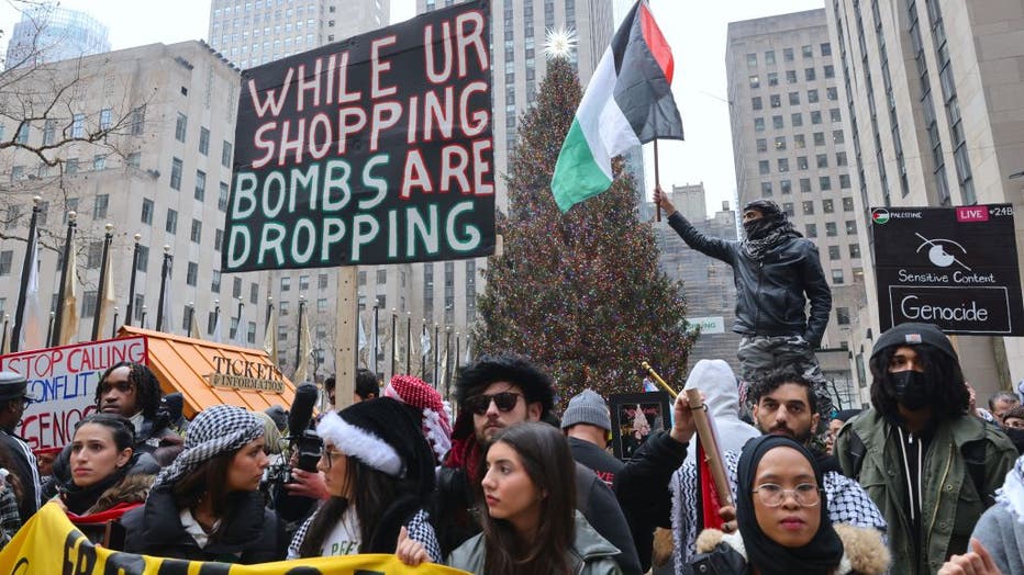 NEW YORK - Red and green flooded the streets of Midtown Christmas Day alongside signs that read ‘No joy in Genocide.'