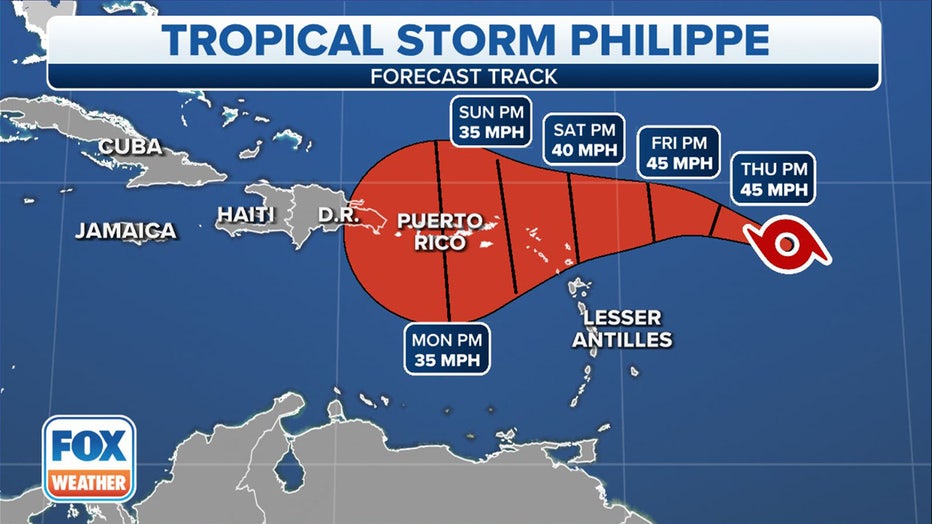 Philippe is currently 600 miles east of the northern Leeward Islands and is expected to continue moving west-northwest over the next few days. On the current forecast track, Philippe could impact the northern Leeward Islands, the U.S. and British Virgin Islands and Puerto Rico beginning Friday.