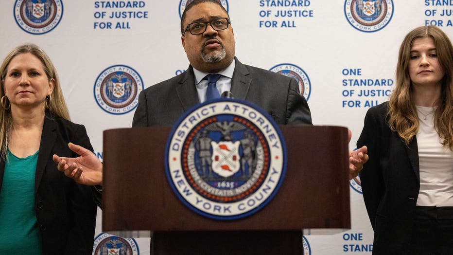 Manhattan District Attorney Alvin Bragg speaks during a news conference about former Hollywood film producer Harvey Weinstein's rape and sexual assault re-trial in New York on June 12, 2025. The judge in the Harvey Weinstein sex crimes retrial declar