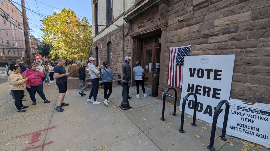 HOBOKEN, NJ - OCTOBER 26: People stand in line as they wait to vote on the first day of early voting in Hudson County on October 26, 2024, in Hoboken, New Jersey. (Photo by Gary Hershorn/Getty Images)