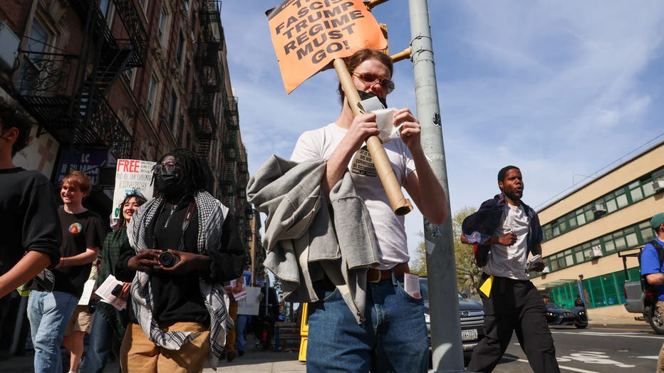 NEW YORK, NEW YORK - APRIL 25: Protesters participate in a march and rally from City College to Columbia University on April 25, 2025 in New York City. The demonstrators, many of them supporters of Palestine, demanded an end to cuts in university fun