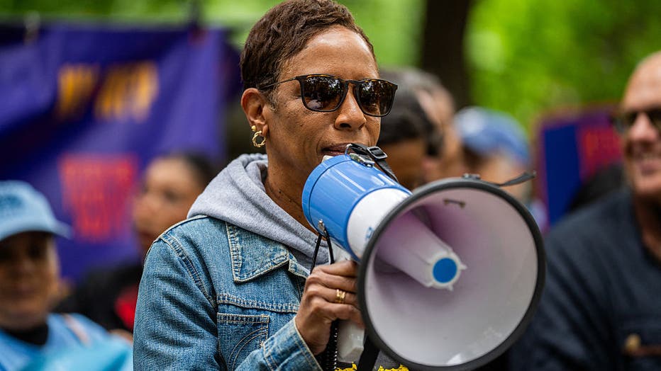 Council Speaker Adrienne Adams addresses the crowd during the New York Working Families Party rally in Fort Greene Park, Brooklyn, New York, USA. (Photo by Madison Swart / Hans Lucas / Hans Lucas via AFP) (Photo by MADISON SWART/Hans Lucas/AFP via Ge