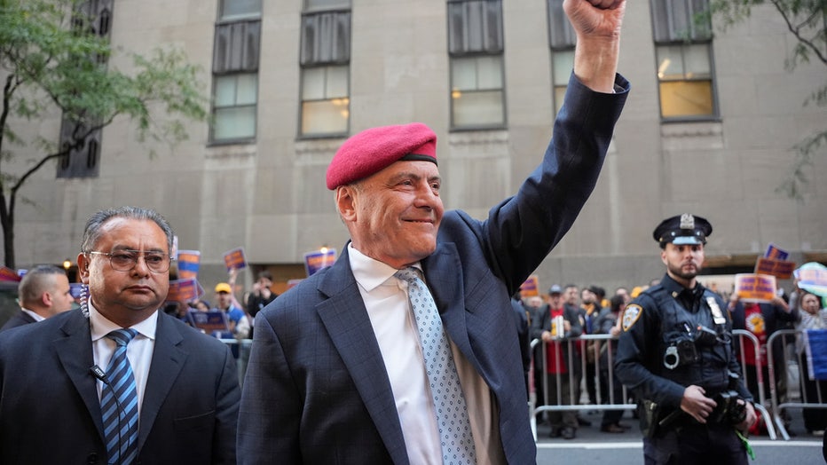 Republican candidate Curtis Sliwa arrives to participate in a mayoral debate, Thursday, Oct. 16, 2025, in New York. (AP Photo/Angelina Katsanis)