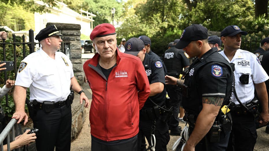 NEW YORK, UNITED STATES - AUGUST 27: Police arrest former Republican mayoral candidate Curtis Sliwa at an anti-immigration protest held in front of NYC Mayor Eric Adams' residence in New York City, United States on August 27, 2023. (Photo by Fatih Ak
