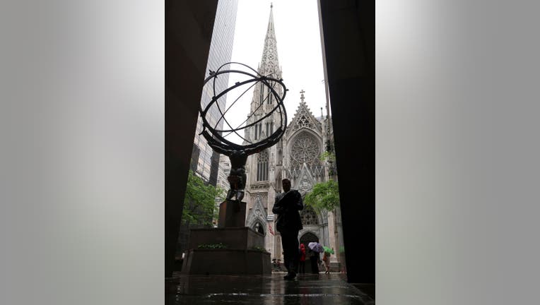 NEW YORK, NY - MAY 16: A man walks past a statue of Atlas in front of St. Patrick's Cathedral on 5th Avenue in the rain on May 16, 2018 in New York City. (Photo by Gary Hershorn/Getty Images)