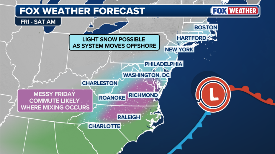This risk extends from southern New England through the Mid-Atlantic and into the Carolinas, a stretch where temperatures near the surface will be cold enough to support ice if precipitation moves through.