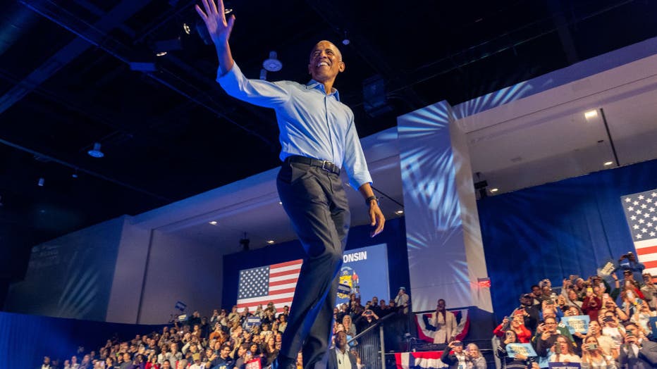 MILWAUKEE, WISCONSIN - NOVEMBER 03: Former U.S. President Barack Obama campaigns in support of Democratic Presidential nominee, Vice President Kamala Harris, at the Baird Center on November 03, 2024 in Milwaukee, Wisconsin. Harris and her Republican