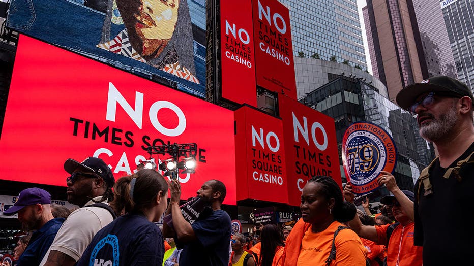 Demonstrators during a rally in support of the casino in front of billboards displaying a message in opposition to it in Times Square in New York, US, on Thursday, June 26, 2025. The Caesars Palace Times Square partners hosted a rally as developer SL