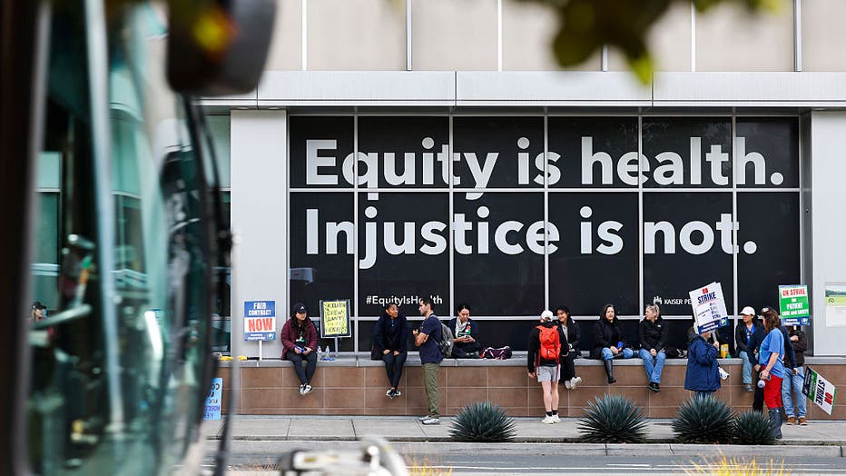 Kaiser workers begin the first of a three-day strike outside of Kaiser Permanente's Broadway Campus in Oakland, California Tuesday, Oct. 14, 2025. (Photo by Jessica Christian/San Francisco Chronicle via Getty Images)