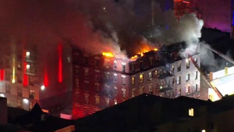 SkyFOX showed crews working to put out flames that appeared to engulf the top floor and roof of the building in the Belmont section.