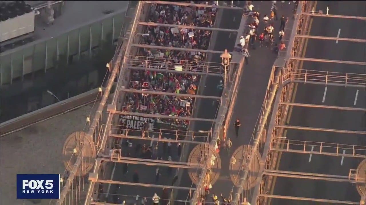Thousands of Pro-Palestinian demonstrators marched across the Brooklyn Bridge Saturday, closing it for 2 hours. Fox 5 NY?s Richard Giacovas has more.