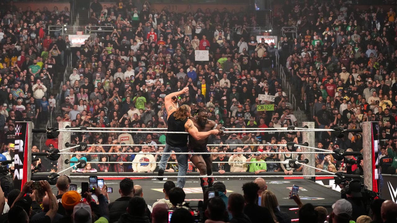 BOSTON, MASSACHUSETTS - MARCH 23: Oba Femi in action against Brock Lesnar during Monday Night RAW at TD Garden on March 23, 2026 in Boston, Massachusetts. (Photo by WWE/WWE via Getty Images)