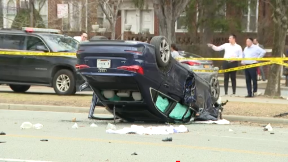 The impact pushed the Camry aside, and the Audi continued forward, striking a woman and her three children who were crossing the street before overturning.