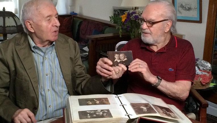 Brothers Alexander Feingold, left, and Joseph Feingold look at photo of themselves as boys in Joseph's apartment in New York on June 8, 2015. (Raphaela Neihausen via AP)