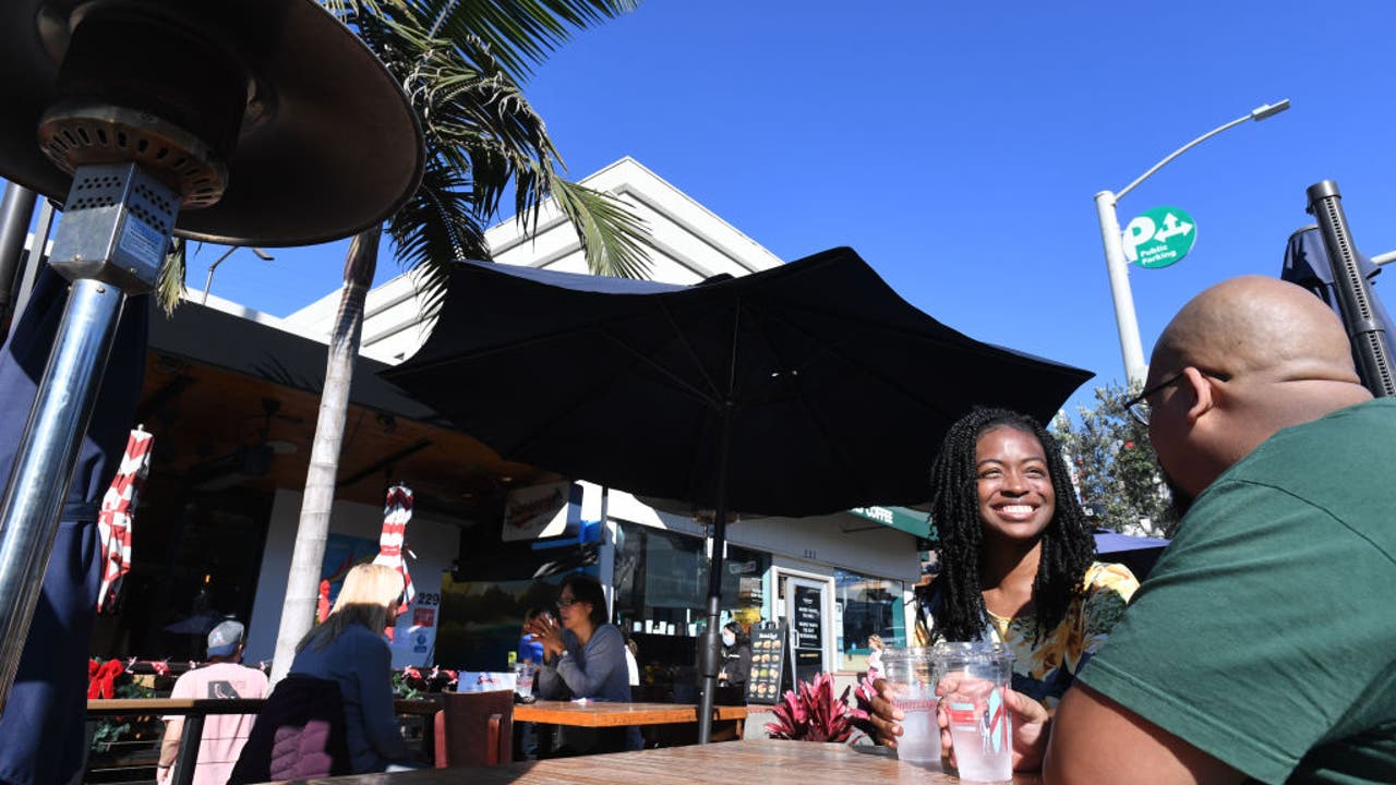 MANHATTAN BEACH, CA - DECEMBER 04: Mr. and Mrs. Delgado enjoyed the sun and their takeout meal at Simmzy's in Manhattan Beach on Friday, December 4, 2020. The city has allowed the repurposing of outdoor dining spots to public right-of-way and general