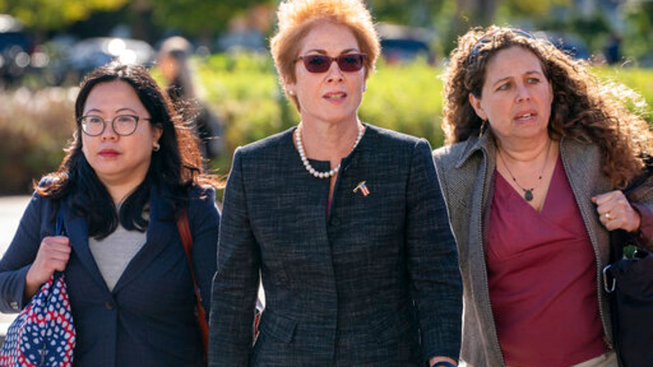 Former U.S. ambassador to Ukraine Marie Yovanovitch, center, arrives on Capitol Hill, Friday, Oct. 11, 2019, in Washington, as she is scheduled to testify before congressional lawmakers on Friday as part of the House impeachment inquiry into Presiden