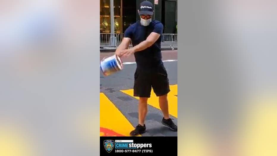 Just after Noon Monday, a man threw red paint on the large, yellow letters, on Fifth Avenue in Midtown. Video of the incident shared by police Tuesday shows the man dropping the paint can and running off along West 56th Street.