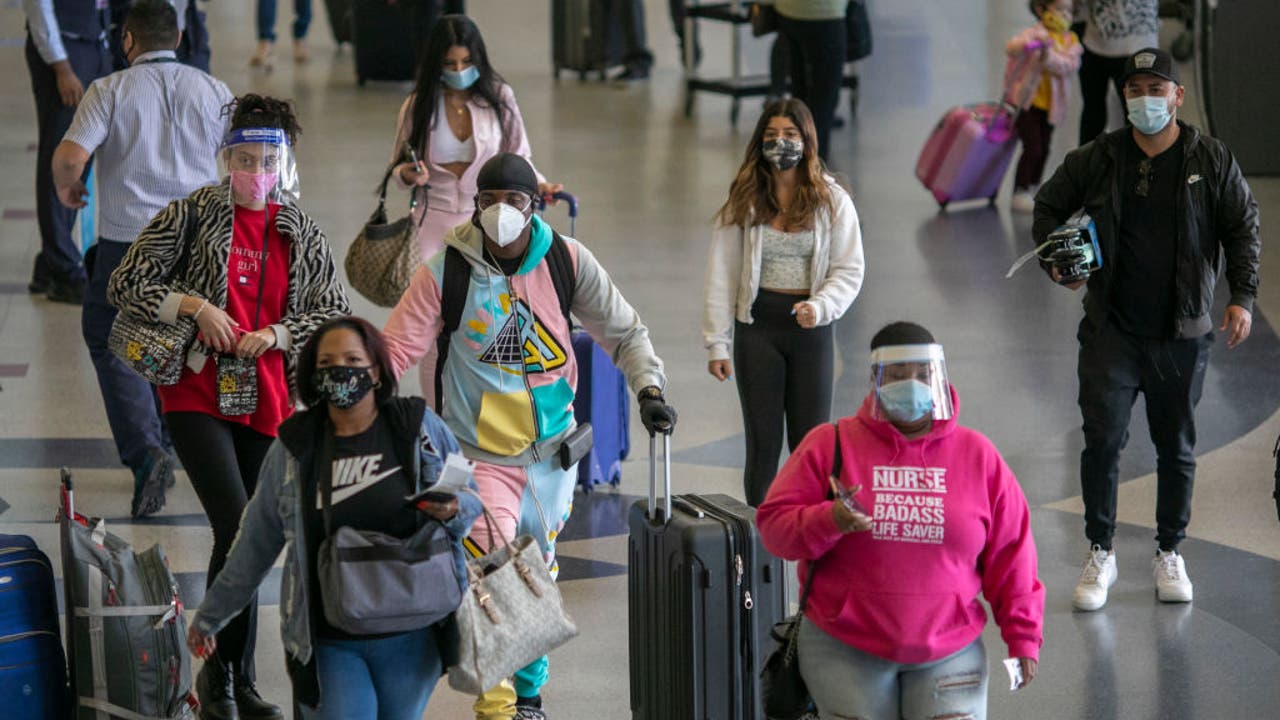 Holiday travelers pass through Los Angeles International Airport on Thanksgiving eve as the COVID-19 spike worsens and stay-at-home restrictions are increased on Nov. 25, 2020 in Los Angeles, California. (Photo by David McNew/Getty Images)