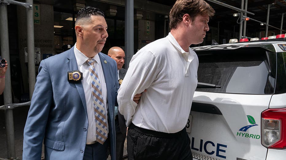 William Duplessie is pictured in police custody leaving the NYPD's 13th Precinct stationhouse in Manhattan, New York, on Tuesday, May 27, 2025. (Barry Williams / New York Daily News via Getty Images)