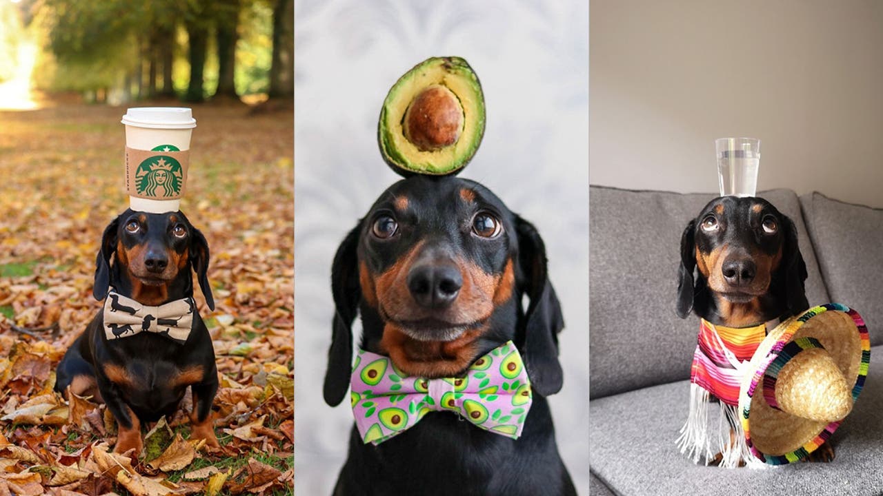 An adorable dachshund has become a viral sensation for balancing a series of random objects on his head.