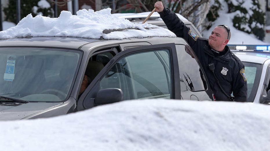 BOSTON - FEBRUARY 18: A Boston Police officer pulled over a car on Blue Hill Avenue with too much snow on its roof, but began clearing it when he saw the driver was elderly person. (Photo by David L. Ryan/The Boston Globe via Getty Images)