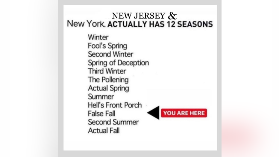 "Fake fall" is one of 12 seasons coined by those living in New Jersey and New York to describe the unpredictable weather experienced by the region throughout the year.