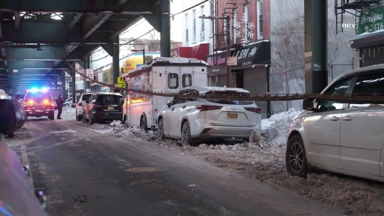 FDNY said crews were dispatched at 6:21 a.m. to the area of Fulton Street and Elton Street for reports of wires down and blocking the roadway. Video from the scene showed long cables draped across multiple parked vehicles and stretched low across the street beneath the elevated tracks, while firefighters and MTA workers assessed the area.