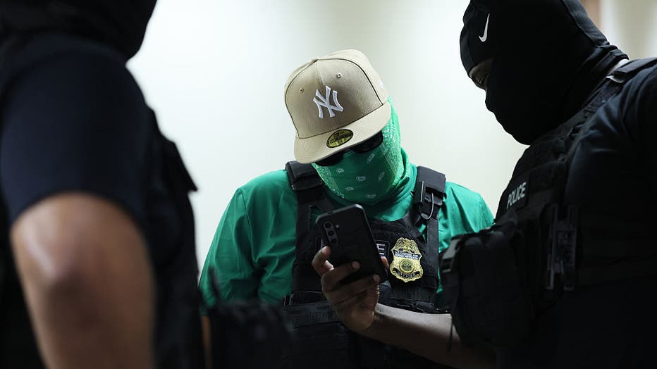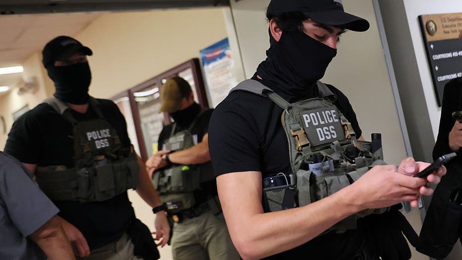NEW YORK, NEW YORK - AUGUST 14: Federal agents patrol the halls of immigration court at the Jacob K. Javitz Federal Building on August 14, 2025 in New York City.(Photo by Michael M. Santiago/Getty Images)