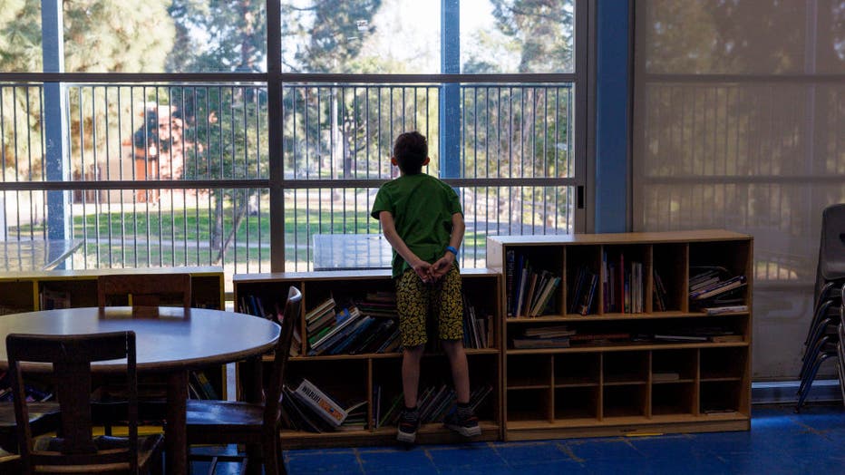 LOS ANGELES, CA - JANUARY 15, 2025: A youngster looks out the window while waiting for his parents to pick up up at the end of the day at Project Camp, free child care to families impacted by the fires, at Eagle Rock Recreation Center on January 15,
