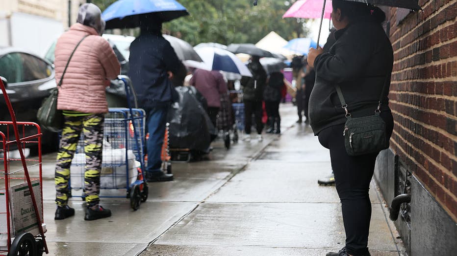 NEW YORK, NEW YORK - OCTOBER 30: People wait for the start of food distribution at New York Common Pantry on October 30, 2025 in New York City. (Photo by Michael M. Santiago/Getty Images)