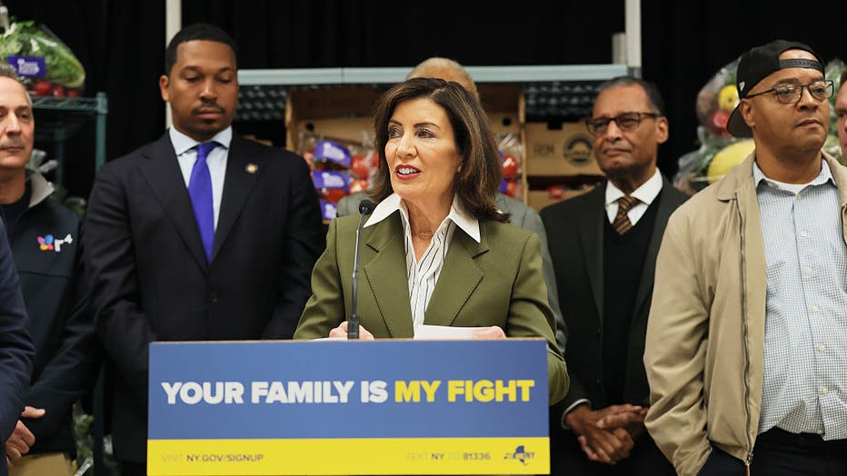 NEW YORK, NEW YORK - OCTOBER 30: New York Gov. Kathy Hochul speaks during a press conference at New York Common Pantry on October 30, 2025 in New York City. The governor had previously announced that the state will have $40 million in emergency food