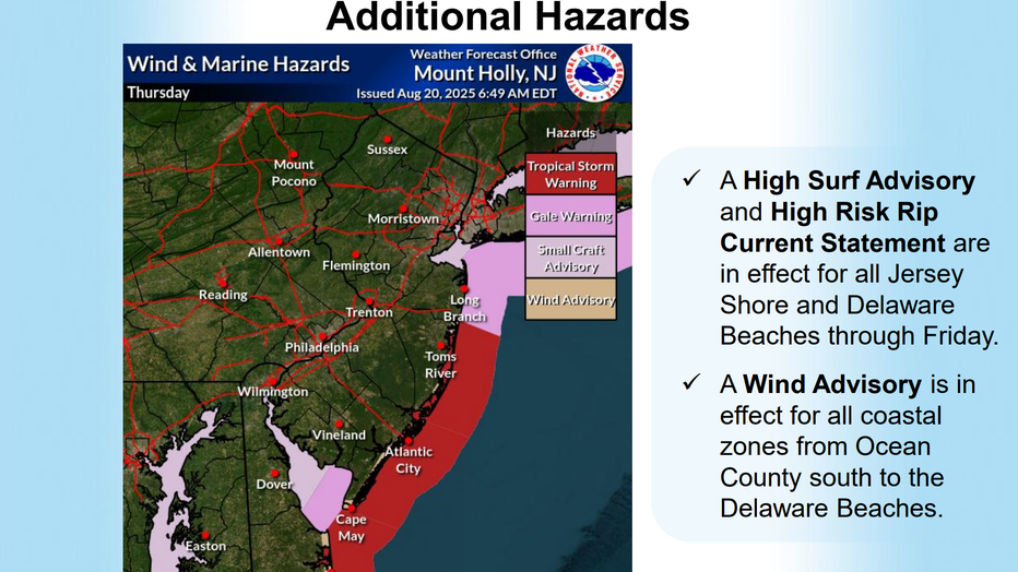 Rip current advisories were issued for New York and New Jersey beginning Tuesday and will remain in place through Friday. Forecasters say the most dangerous conditions will arrive Thursday into Friday, when wave heights are expected to peak.