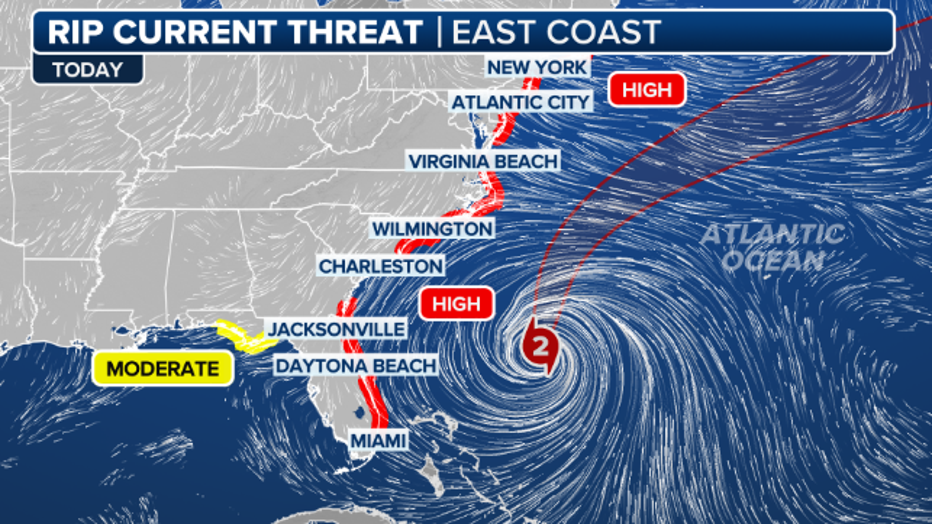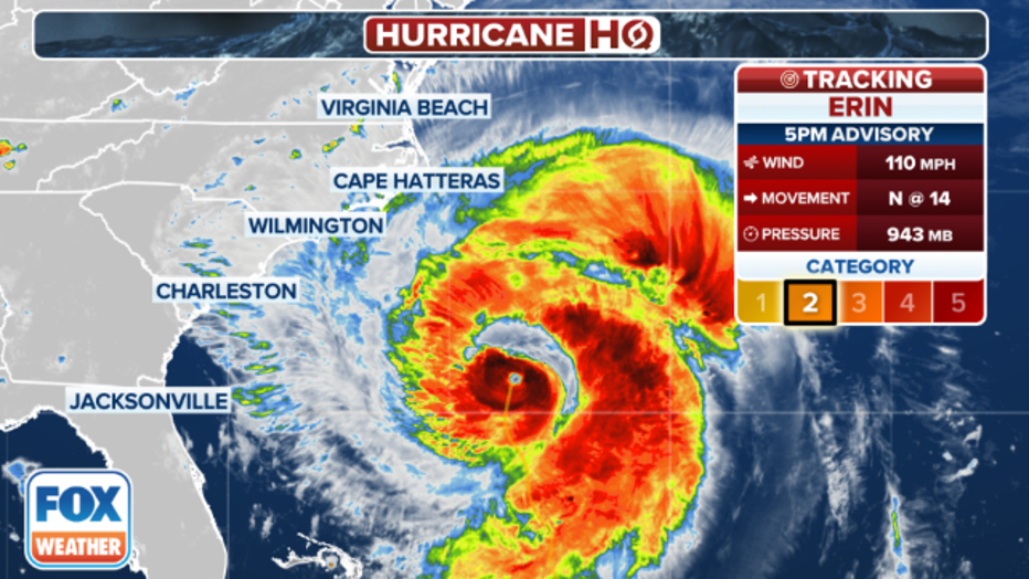 Currently, Erin is a Category 2 storm, but beach-goers should still be wary, as life-threatening surf and dangerous rip currents are forecast to threaten the area all week.