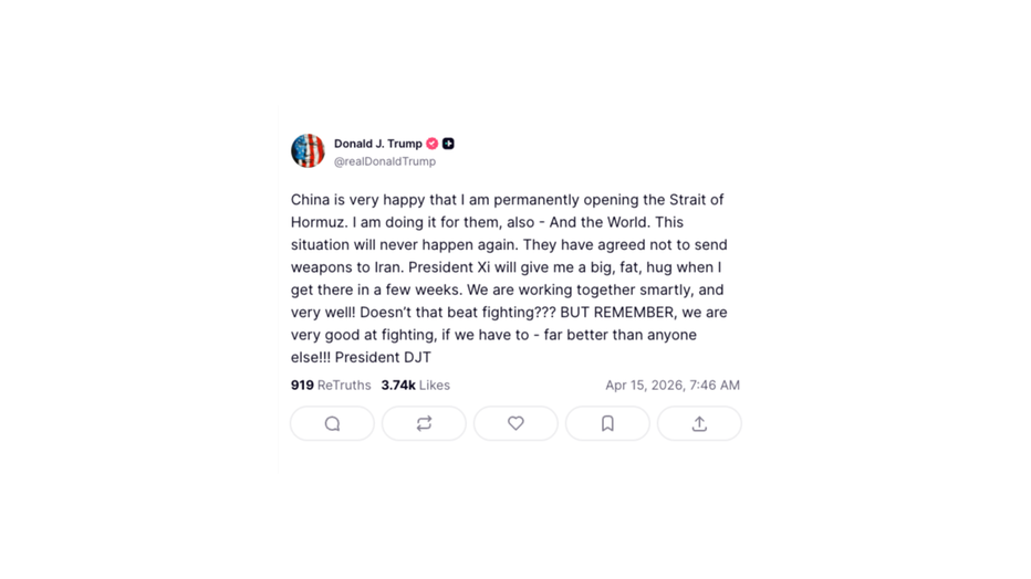 8:05 a.m. ET: President Trump references China in his latest Truth Social post, saying they're "very happy" that he is reopening the Strait of Hormuz.