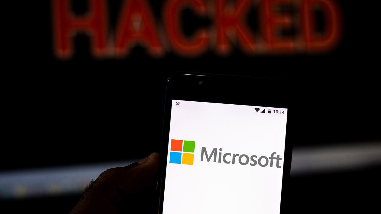 BRAZIL - 2019/08/12: In this photo illustration the Microsoft Corporation logo is seen displayed on a smartphone and red alerting word HACKED on the blurred background. Conceptual photo for data breach. (Photo Illustration by Rafael Henrique/SOPA Ima
