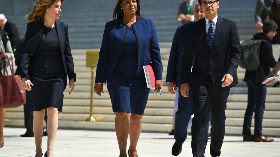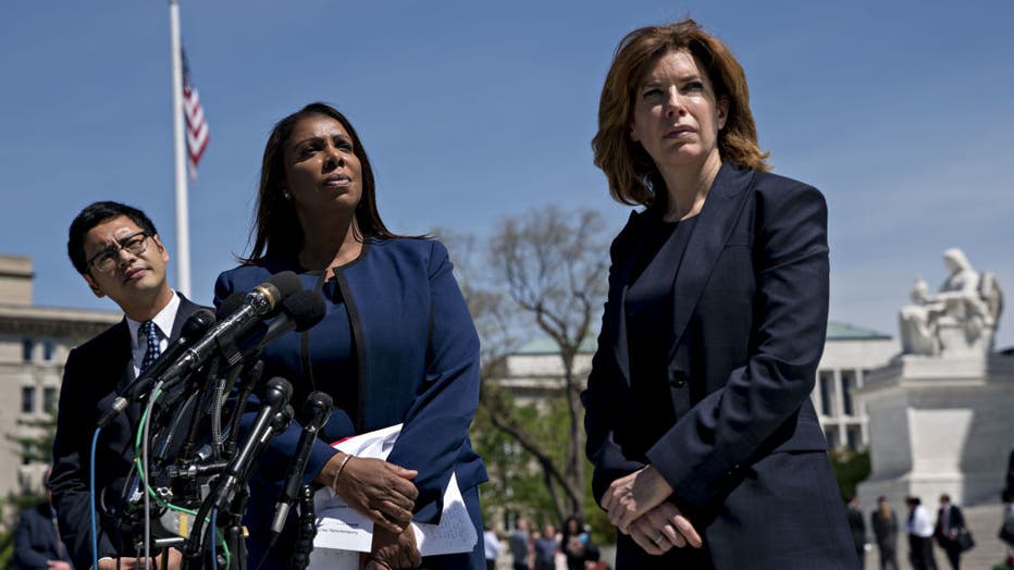 New York Attorney General Letitia James (C), Director of the Census for New York City Julie Menin (L) and ACLU's Voting Rights Project Director Dale Ho (R) approach microphones to speak to reporters outside of the US Supreme Court in Washington, DC o