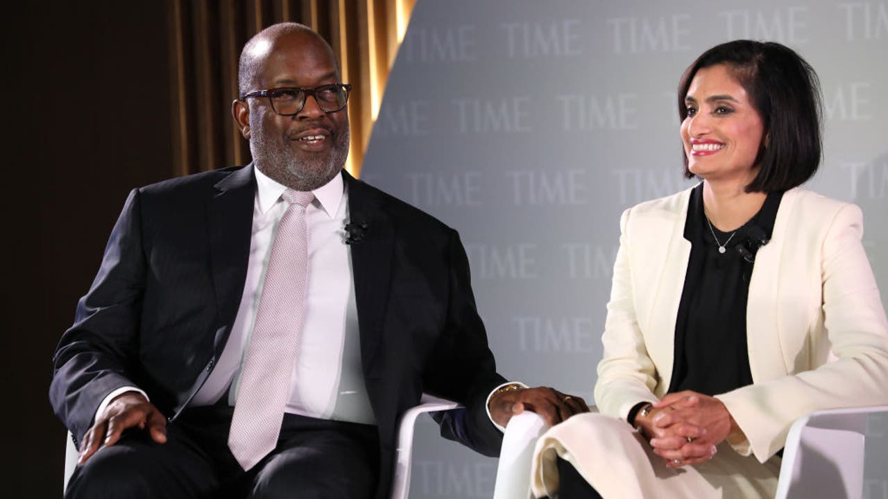 NEW YORK, NEW YORK - OCTOBER 17: Chairman & CEO at Kaiser Permanente, Bernard J. Tyson (L) and Administrator at Centers for Medicare & Medicaid, Seema Verma, speak onstage during the TIME 100 Health Summit at Pier 17 on October 17, 2019 in Ne