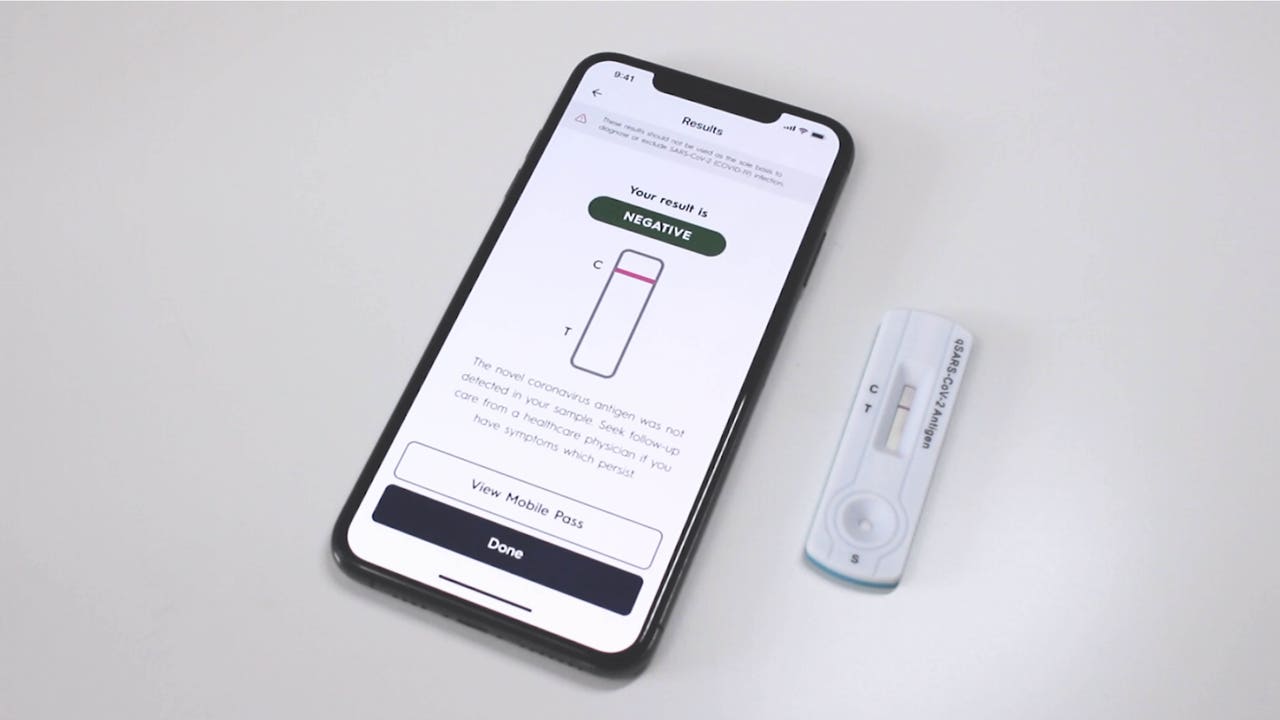 The test, which is pending emergency approval from the U.S. Food and Drug Administration, is performed using a smartphone app and a "lateral flow assay," described as similar to an at-home pregnancy test. Patients follow video instructions on the app to collect a nasal swab, which is included in the kit. The app then prompts the user to scan their test after 15 minutes to see the result.