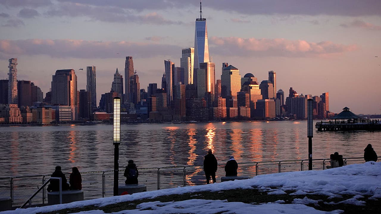 HOBOKEN, NJ - FEBRUARY 14: The sun sets on the skyline of lower Manhattan and One World Trade Center in New York City as people stand on a pier in the Hudson River on February 14, 2026, in Hoboken, New Jersey. (Photo by Gary Hershorn/Getty Images)