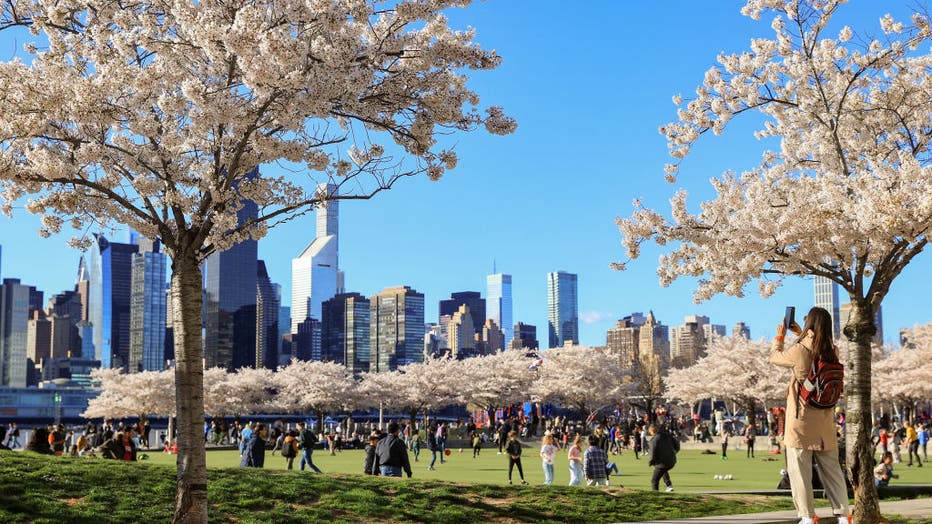NEW YORK, UNITED STATES - APRIL 7: Yoshino cherry trees are in bloom at Hunter's Point South Park, Long Island City, Queens, in New York, United States on April 7, 2024. (Photo by Selcuk Acar/Anadolu via Getty Images)