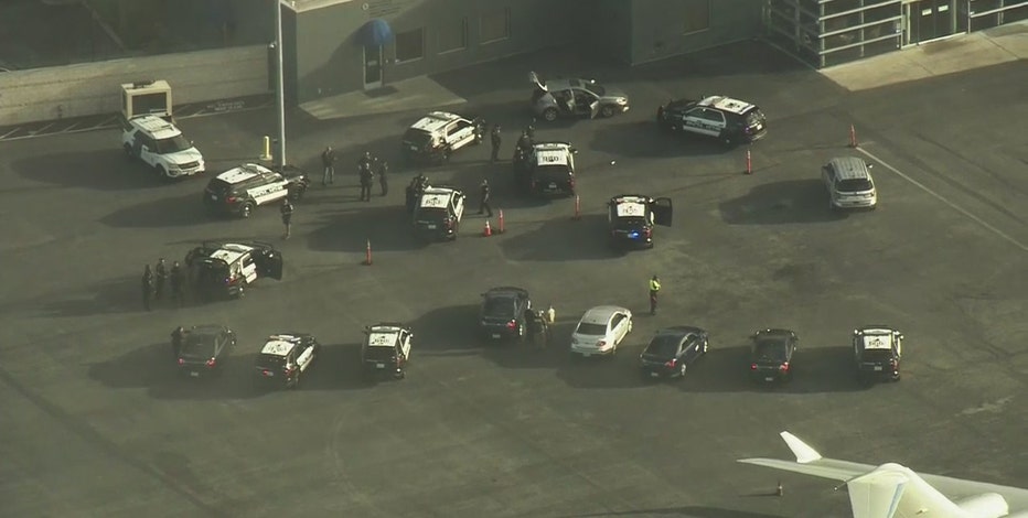The front of the suspect vehicle reads "SOS." A security breach at LAX prompted heavy police presence in the area.