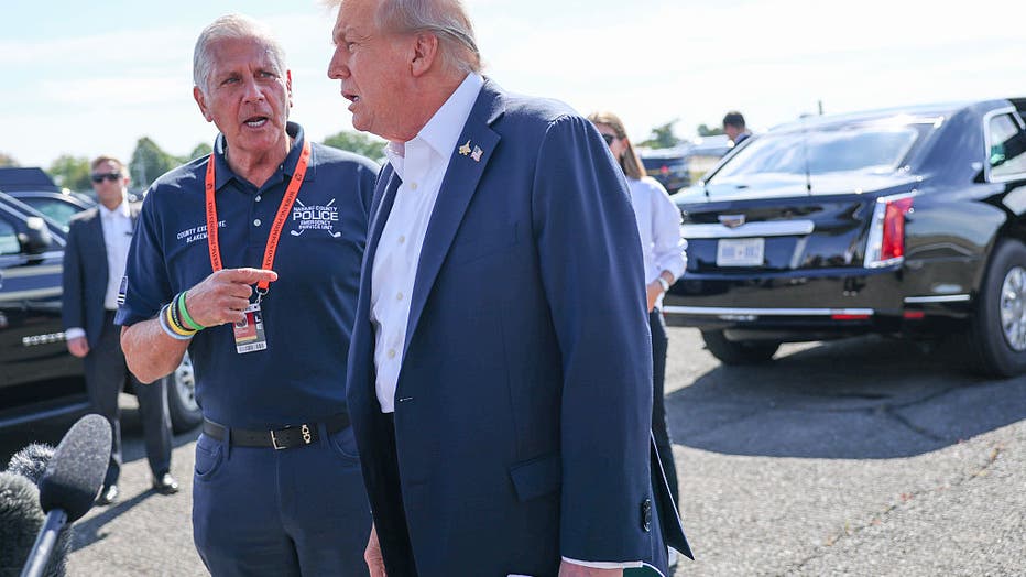 FARMINGDALE, NEW YORK - SEPTEMBER 26: U.S. President Donald Trump is greeted by Bruce Blakeman, County Executive of Nassau County, New York, after arriving at the Republic Airport on Air Force One on September 26, 2025 in Farmingdale, New York. Trump