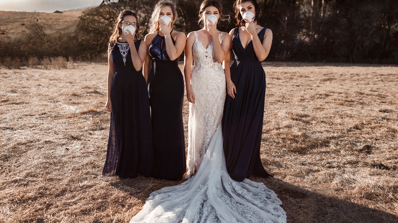 Bridesmaids and the bride cover their faces with air filtration masks because of the Kincade Fire. (Naomi Lehr Valkyrie Photography)