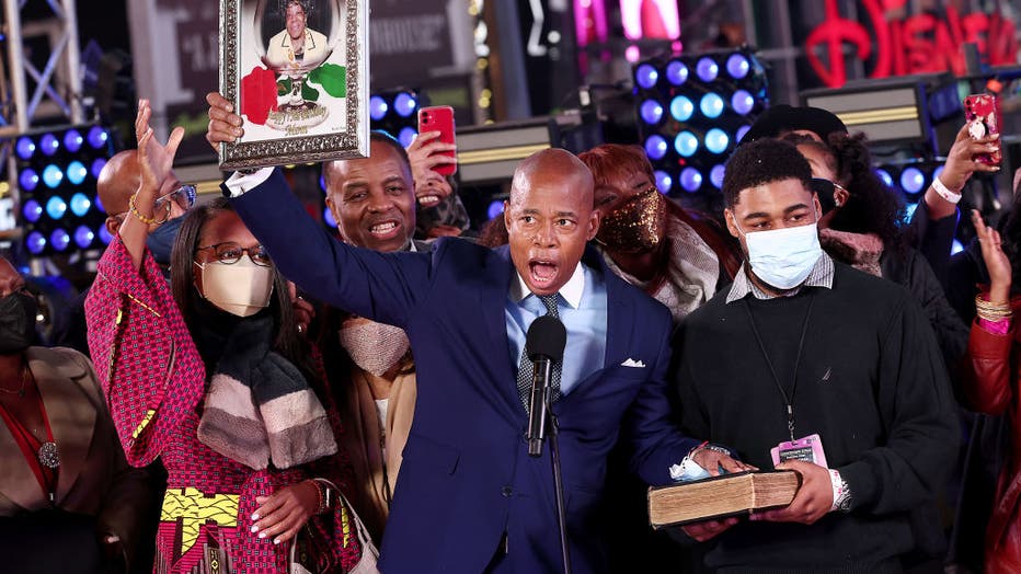 NEW YORK, NEW YORK - JANUARY 01: Eric Adams is sworn in as the 110th mayor of the city of New York on January 01, 2022 in New York, NY. Due to a surge in COVID-19 cases, the official inauguration has been postponed, and Adams chose to be sworn into o