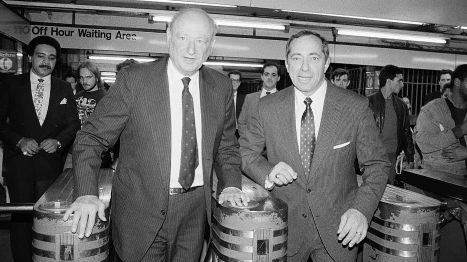 (Original Caption) 10/6/1986-New York, NY: Ready to tell the world that NYC has cleaned the graffiti off the city's 3,000 subway car (it has 6,000), Ed Koch (l) and Mario Cuomo pass through the turnstile near City Hall for the familiar photo op. PH: