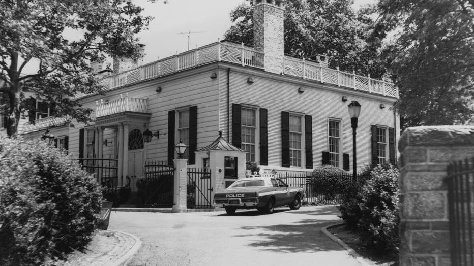 A police car parked outside Gracie Mansion (officially 'Archibald Gracie Mansion'), the official residence of the Mayor of New York City, at East End Avenue and 88th Street, in the Yorkville neighbourhood of Manhattan, New York City, New York, June 1