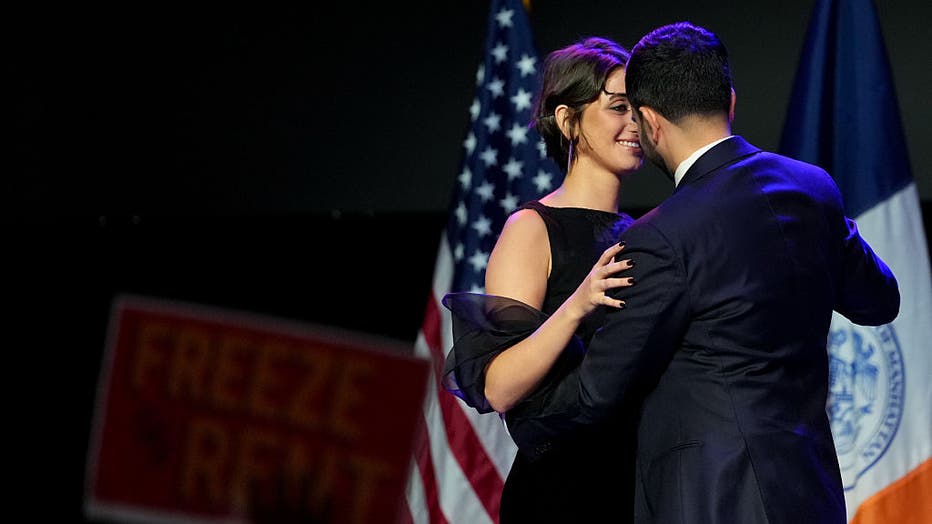 Zohran Mamdani, New York City mayoral candidate, and his wife Rama Duwaji during an election night event at The Brooklyn Paramount Theater in the Brooklyn borough of New York, US, on Tuesday, Nov. 4, 2025. Mamdani was elected the 111th mayor of New Y